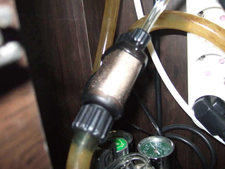 설치 순서는 Co2 솔레노이드 -> 미세조절밸브 -> 버블카운터 -> 역류방지벨브 -> 확산기 순서로 했고 Co2 공금 중단 시 세라믹으로 물이 역류하는 것을 감안해 역류방지 벨브를 최대한 확산기에 가깝게 달았다. 일단 2일째 보고 있는데 아직 확산기 내부에 습기만 차는 정도(사진에 펄처럼 반짝거리는 것이 내부에 습기 방울임)이고 물이 새서 고이거나 하지는 않았다.