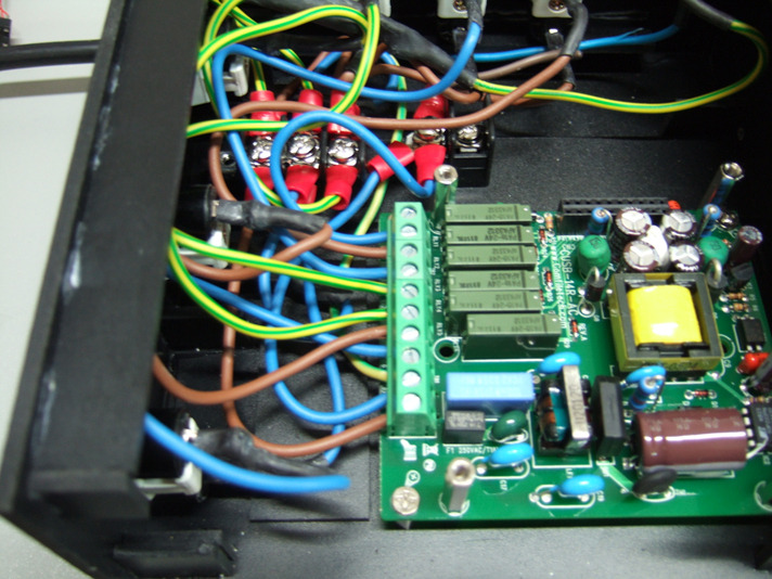 전원부 보드를 케이스에 부착시키고 배선작업을 끝낸 사진입니다. 5A 릴레이 장착이라 수족관용 제품장착 하기에는 무리가 없을것 입니다. 케이스는 3T 포맥스로 만들었으며 30cm x 30cm 짜리 두장이 소비됐습니다.