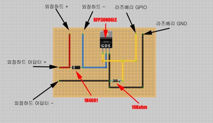 회로의 구성은 위와 같습니다. 필요한 부품은 NPN타잎 Mofset 인 RFT30N06LE 1개와 10K옴 짜리 저항한개 1N4001 다이오드 한개 입니다. 회로 설명은 라즈베리 GPIO 로 전원이 들어와 대기하고 있던 외장하드 아답터 + [...]